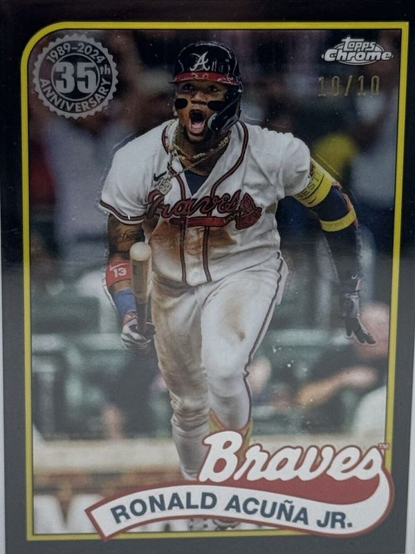 The Ronald Acuna Jr. 2024 Topps Chrome #89CB-3 1989 Baseball - Black Refractor /10 card is 1 of 62 Ronald Acuna Jr.'s card variations in the 2024 Topps Chrome set being tracked by Sports Card Investor, including Base, Image Variation (Reaching Up), Pink Refractor, X Fractor, and Magenta Speckle Refractor /350.
