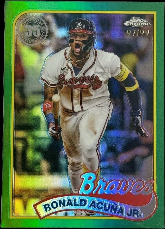 The Ronald Acuna Jr. 2024 Topps Chrome #89CB-3 1989 Baseball - Green Refractor /99 card is 1 of 62 Ronald Acuna Jr.'s card variations in the 2024 Topps Chrome set being tracked by Sports Card Investor, including Base, Image Variation (Reaching Up), Pink Refractor, X Fractor, and Magenta Speckle Refractor /350.