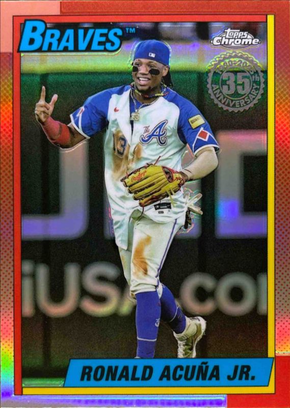 The Ronald Acuna Jr. 2025 Topps Chrome #90CB-2 1990 Baseball card is 1 of 133 Ronald Acuna Jr.'s card variations in the 2025 Topps Chrome set being tracked by Sports Card Investor, including Base, Geometric Refractor, Image Variation, Lightboard Logo Variation, and Negative Refractor.