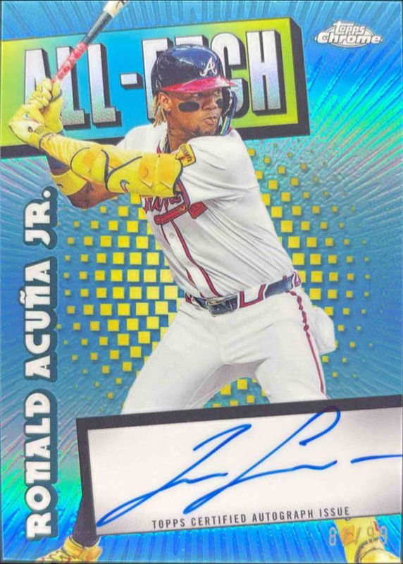 The Ronald Acuna Jr. 2025 Topps Chrome #CAE-RA Chrome All-Etch Autographs /99 card is 1 of 133 Ronald Acuna Jr.'s card variations in the 2025 Topps Chrome set being tracked by Sports Card Investor, including Base, Geometric Refractor, Image Variation, Lightboard Logo Variation, and Negative Refractor.