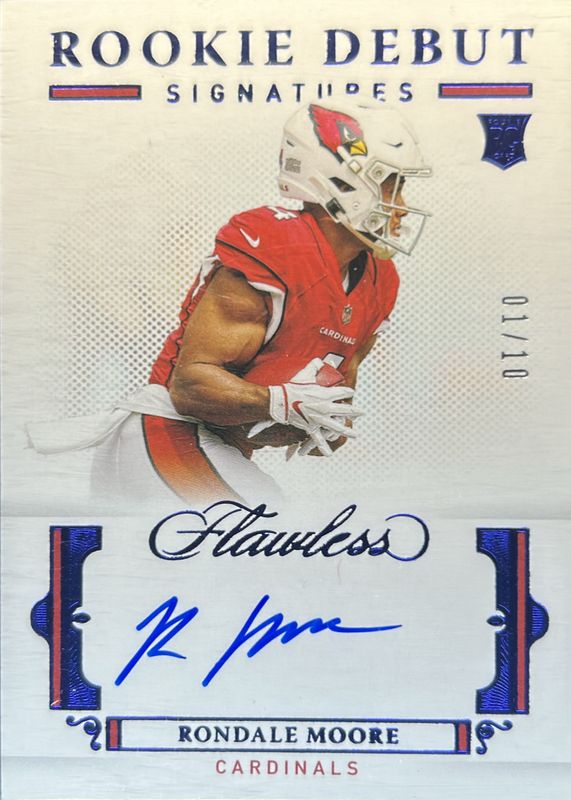 The Rondale Moore 2021 Flawless #RDS-RMO Rookie Debut Signatures - Sapphire (/10) card in Raw condition has not changed in price in the last 30 days and was last sold for $26.07 .