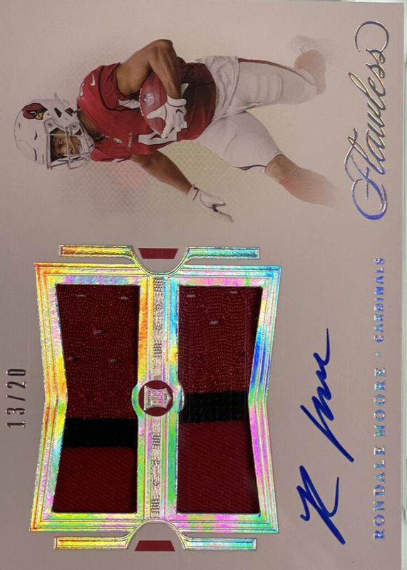 The Rondale Moore 2021 Flawless #RDPA-RMO Rookie Dual Patch Auto - Silver (/20) card in Raw condition has not changed in price in the last 30 days and was last sold for $41.00 .