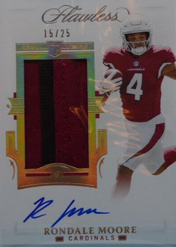 The Rondale Moore 2021 Flawless #RPA-RMO Rookie Patch Auto (/25) card in Raw condition has not changed in price in the last 30 days and was last sold for $42.00 .