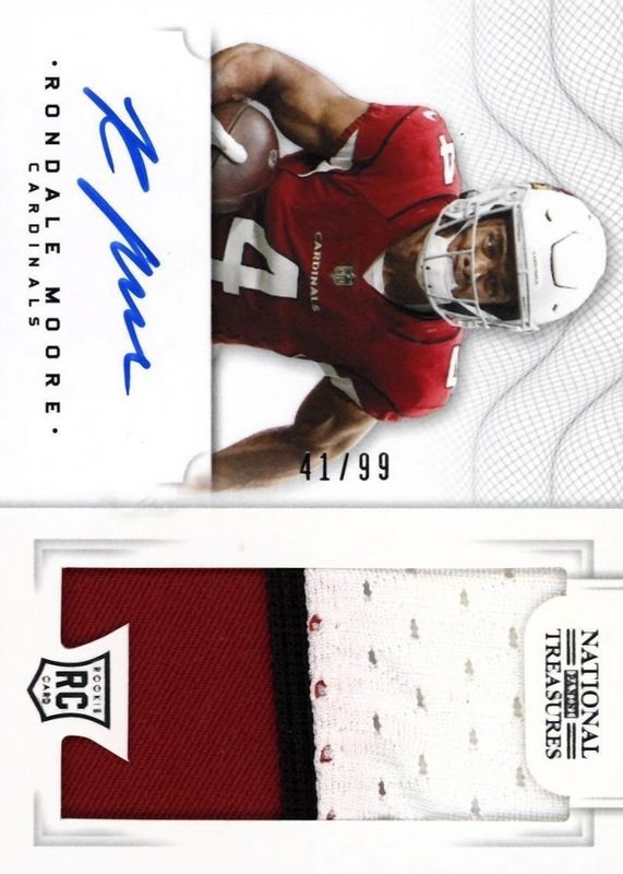 This card is 1 of 46 Rondale Moore's card variations in the 2021 National Treasures set being tracked by Sports Card Investor, including Rookie Patch Auto /99, Rookie Patch Auto - Green Jersey Number (/4), Rookie Patch Auto - Purple /49, Rookie Patch Auto - Holo Silver /25, and Rookie Patch Auto - Stars & Stripes Holo Silver /25.