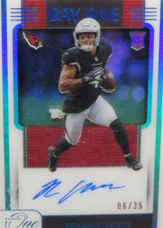 The Rondale Moore 2021 One #114 Day One Autographs - Blue (/35) Rookie card in Raw condition has not changed in price in the last 30 days and was last sold for $15.54 .