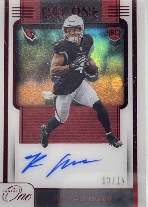The Rondale Moore 2021 One #114 Day One Autographs - Red (/15) Rookie card in Raw condition has not changed in price in the last 30 days and was last sold for $17.02 .