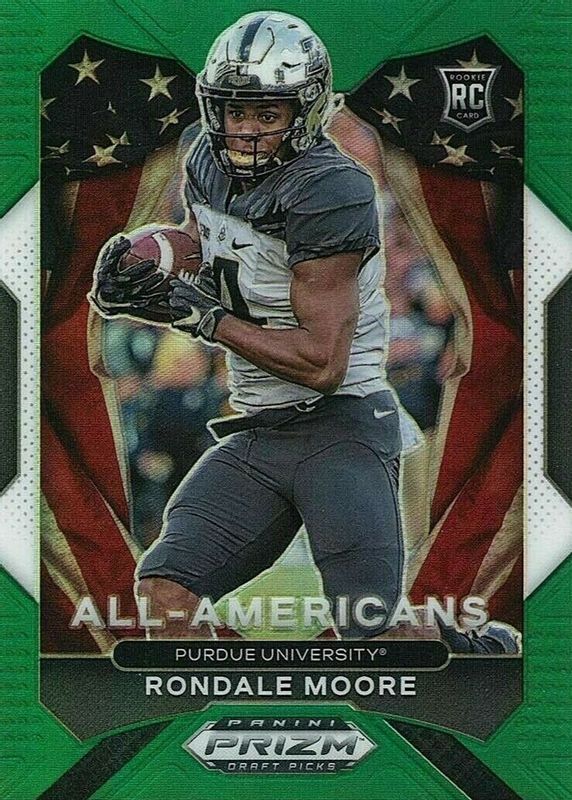 The Rondale Moore 2021 Prizm Draft Picks #187 All-Americans - Green Rookie card in Raw condition has not changed in price in the last 30 days and was last sold for $1.95 .