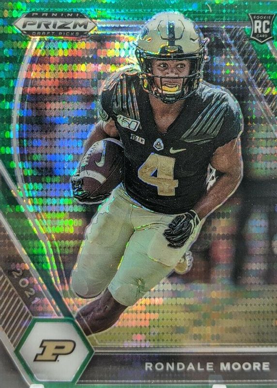 The Rondale Moore 2021 Prizm Draft Picks #129 Green Pulsar /25 Rookie card in Raw condition has not changed in price in the last 30 days and was last sold for $6.00 .