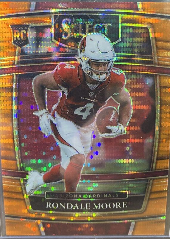 The Rondale Moore 2021 Select #58 Concourse Neon Orange Pulsar /7 Rookie card in Raw condition has not changed in price in the last 30 days and was last sold for $7.00 .
