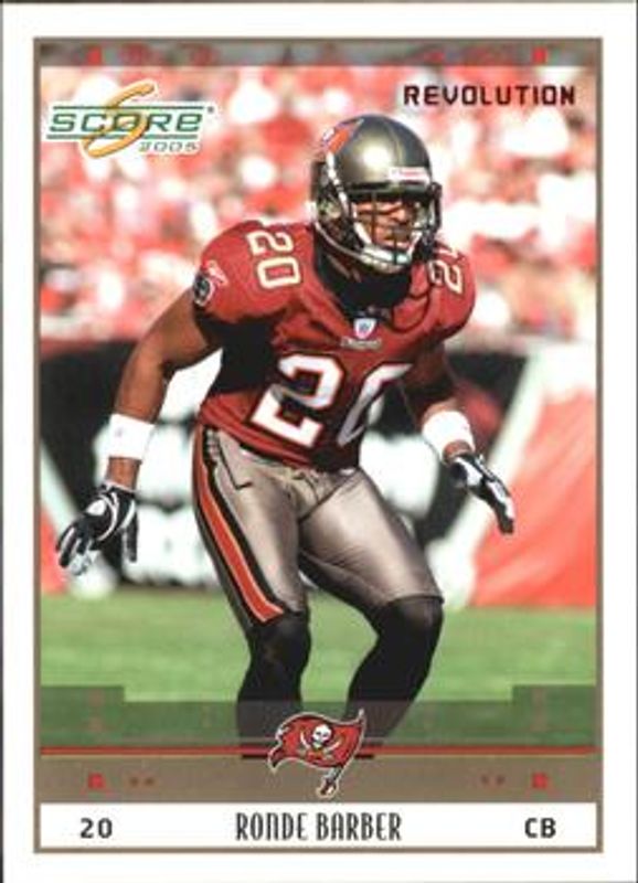 The Ronde Barber 2005 Score #281 Revolution /199 card is 1 of 6 Ronde Barber's card variations in the 2005 Score set being tracked by Sports Card Investor, including Base, Glossy, Scorecard /599, Adrenaline /399, and Final Score /17.