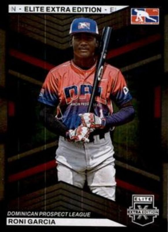 The Roni Garcia 2023 Elite Extra Edition #174 Base card is 1 of 48 Roni Garcia's card variations in the 2023 Elite Extra Edition set being tracked by Sports Card Investor, including Pink, Signatures, Status Green /499, Signatures die-cut /399, and Aspirations Blue /349.