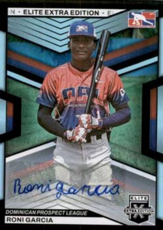The Roni Garcia 2023 Elite Extra Edition #174 Signatures card is 1 of 48 Roni Garcia's card variations in the 2023 Elite Extra Edition set being tracked by Sports Card Investor, including Base, Pink, Status Green /499, Signatures die-cut /399, and Aspirations Blue /349.