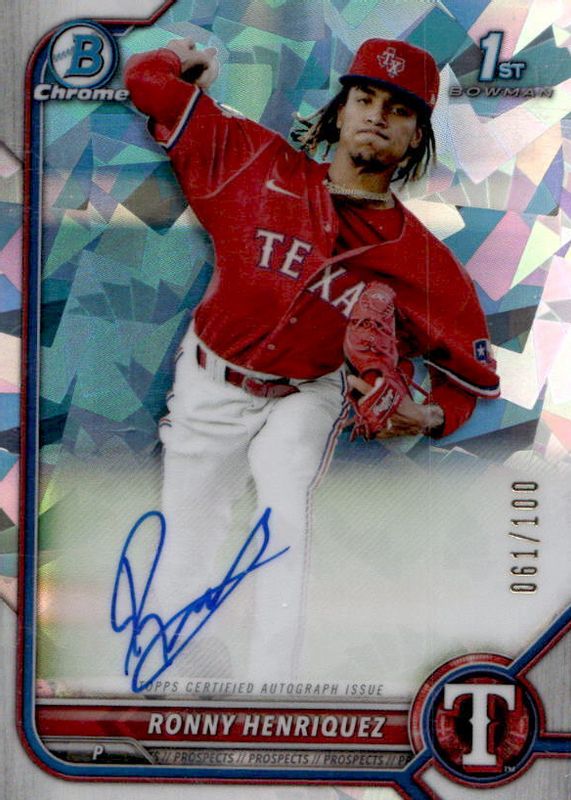 This card is 1 of 16 Ronny Henriquez's card variations in the 2022 Bowman set being tracked by Sports Card Investor, including Chrome Prospect Auto (1st), Chrome Prospect Auto - Refractor /499 (1st), Chrome Prospect Auto - Speckle Refractor /299 (1st), Chrome Prospect Auto - Purple Refractor /250 (1st), and Chrome Prospect Auto - Blue Refractor /150 (1st).