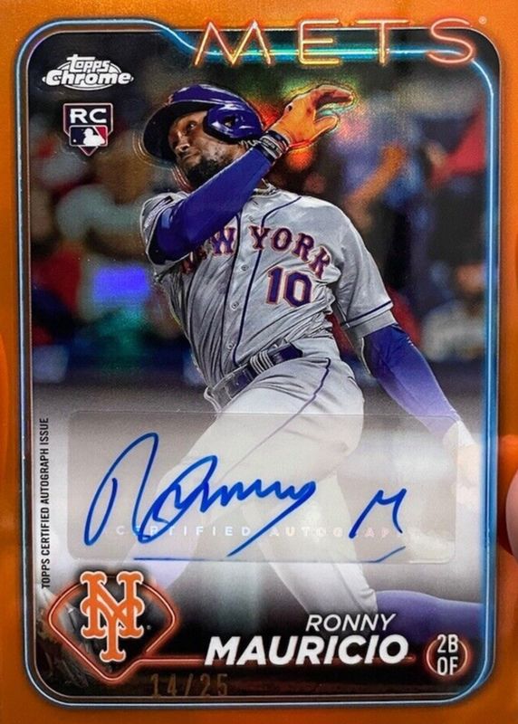 The Ronny Mauricio 2024 Topps Chrome Update #AC-RM Autographs - Orange Refractor /25 Rookie card in Raw condition has not changed in price in the last 30 days and was last sold for $117.50 .