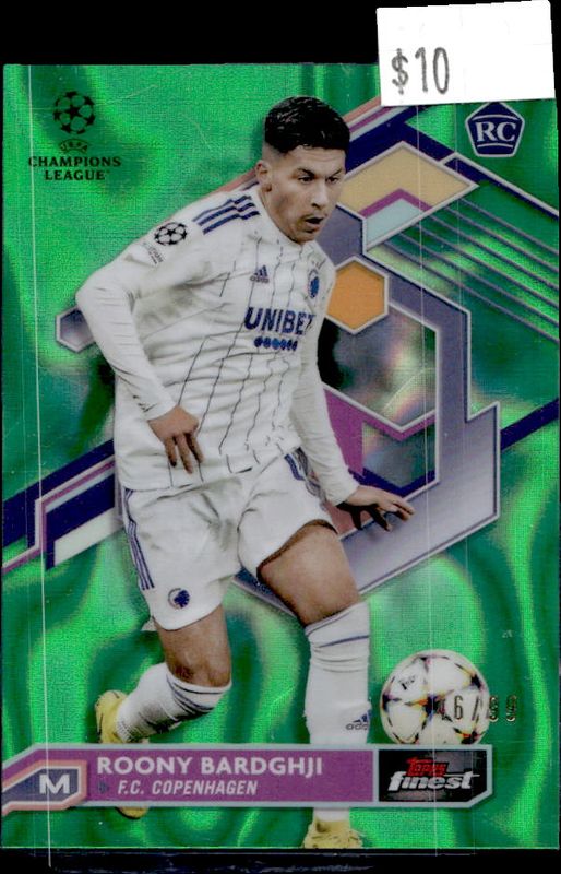 The Roony Bardghji 2022 Topps Finest UEFA Club Competitions #92 Green Lava Refractor /99 Rookie card is 1 of 28 Roony Bardghji's card variations in the 2022 Topps Finest UEFA Club Competitions set being tracked by Sports Card Investor, including Base, Refractor, Purple Refractor /299, Sky Blue Refractor /275, and Blue Aqua Vapor Wave Refractor /250.