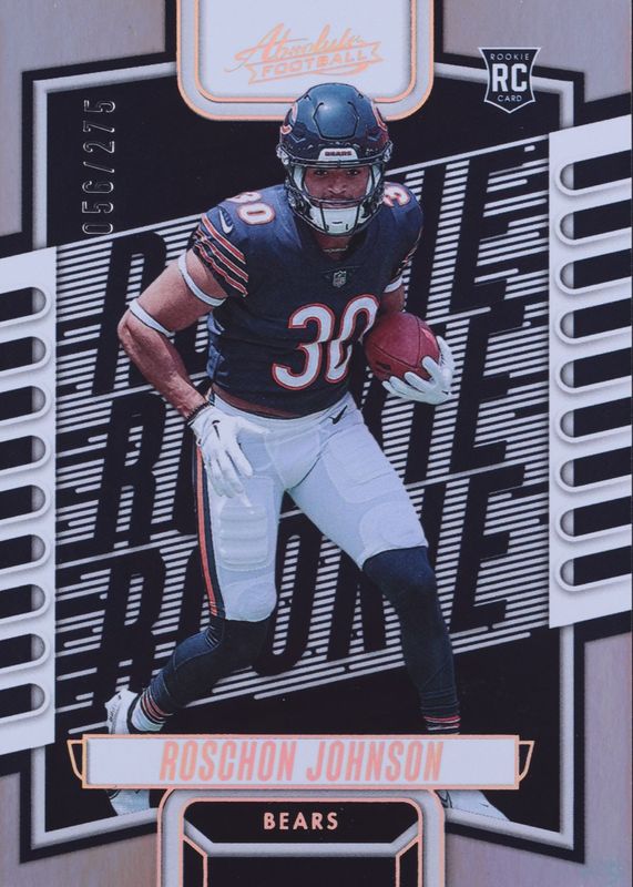 The Roschon Johnson 2023 Absolute #134 Spectrum /275 Rookie card in Raw condition has not changed in price in the last 30 days and was last sold for $0.99 .