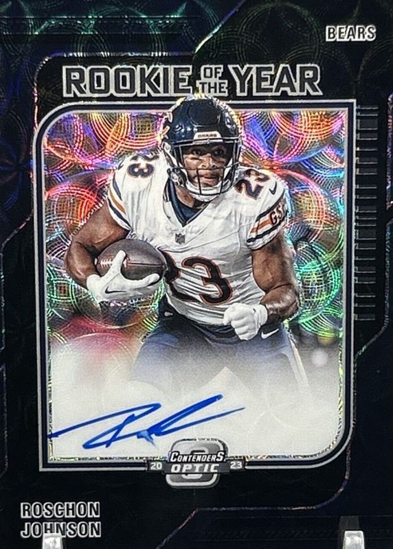 The Roschon Johnson 2023 Contenders Optic #ROY-RJ Rookie of the Year Contenders Autographs - Black Scope /25 card in Raw condition has not changed in price in the last 30 days and was last sold for $19.99 .