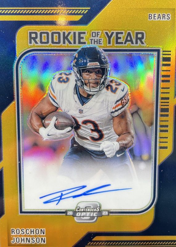 The Roschon Johnson 2023 Contenders Optic #ROY-RJ Rookie of the Year Contenders Autographs - Gold /10 card in Raw condition has not changed in price in the last 30 days and was last sold for $40.00 .