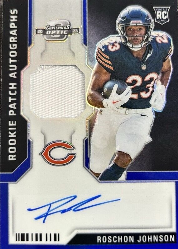 2023 Contenders Optic Roschon Johnson Rookie Patch Auto Blue Prizm RC #/50 Bears