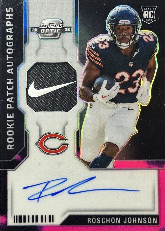 The Roschon Johnson 2023 Contenders Optic #RPA-RJ Rookie Patch Auto - Nebula /2 card in Raw condition has not changed in price in the last 30 days and was last sold for $152.50 .