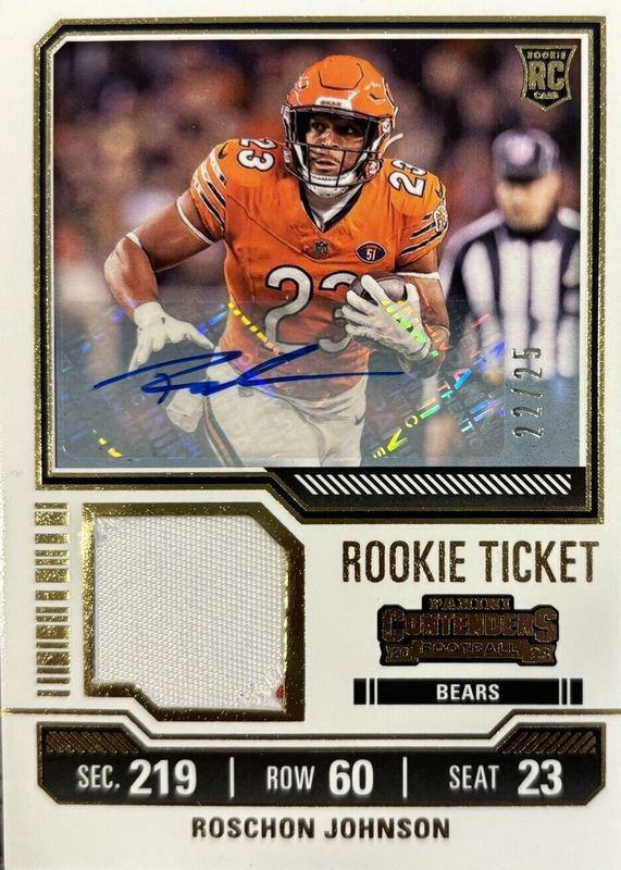 This card is 1 of 29 Roschon Johnson's card variations in the 2023 Contenders set being tracked by Sports Card Investor, including Rookie Ticket Auto - Opening Kickoff Ticket, Rookie Ticket Auto - Red Zone Ticket, Rookie Ticket Auto - Ticket Stub (/23), Rookie Ticket Auto Variation, and Rookie Ticket Auto Variation - Opening Kickoff Ticket.