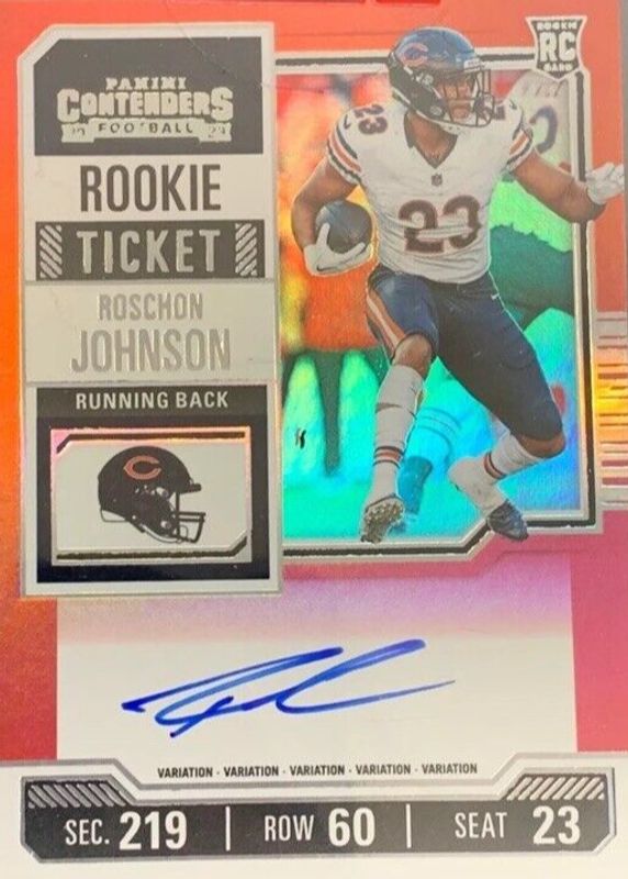 This card is 1 of 29 Roschon Johnson's card variations in the 2023 Contenders set being tracked by Sports Card Investor, including Rookie Ticket Auto, Rookie Ticket Auto - Opening Kickoff Ticket, Rookie Ticket Auto - Red Zone Ticket, Rookie Ticket Auto - Ticket Stub (/23), and Rookie Ticket Auto Variation.