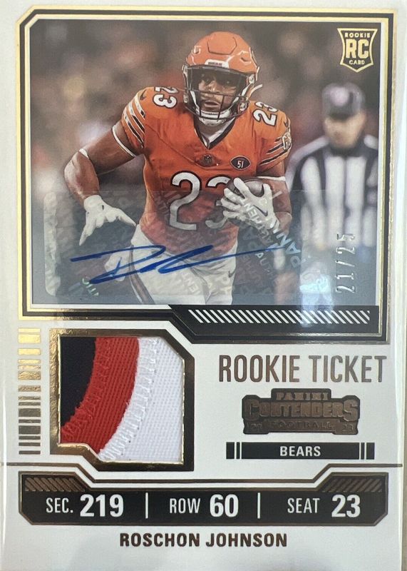 The Roschon Johnson 2023 Contenders #TS29 Rookie Ticket Swatches Autographs /25 card in Raw condition has not changed in price in the last 30 days and was last sold for $40.00 .