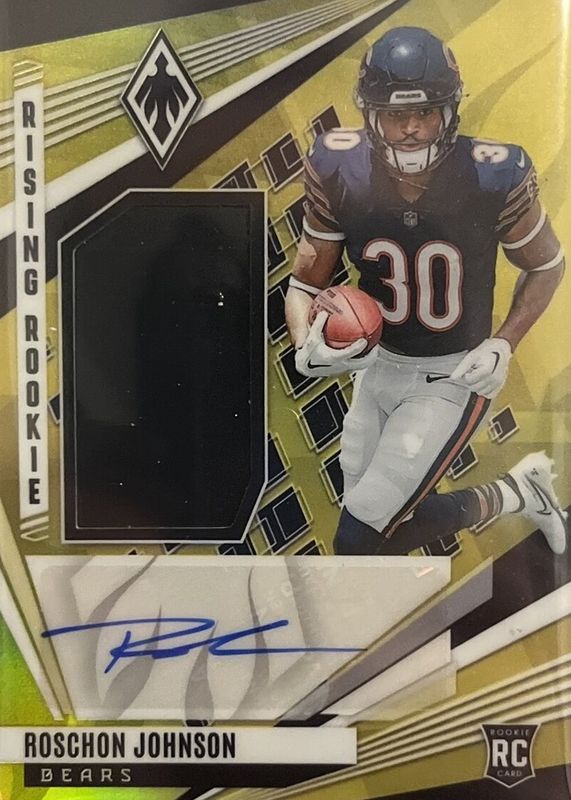 The Roschon Johnson 2023 Phoenix #RMS-RJO Rising Rookie Material Signatures - Helmet /25 card in Raw condition has not changed in price in the last 30 days and was last sold for $16.50 .