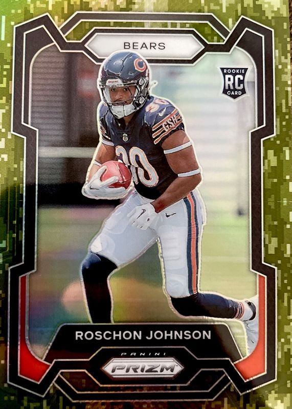 This card is 1 of 82 Roschon Johnson's card variations in the 2023 Prizm set being tracked by Sports Card Investor, including Base, Disco, Green, Green Ice, and Green Wave.