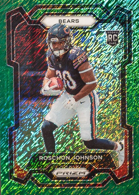 This card is 1 of 82 Roschon Johnson's card variations in the 2023 Prizm set being tracked by Sports Card Investor, including Base, Disco, Green, Green Ice, and Green Wave.