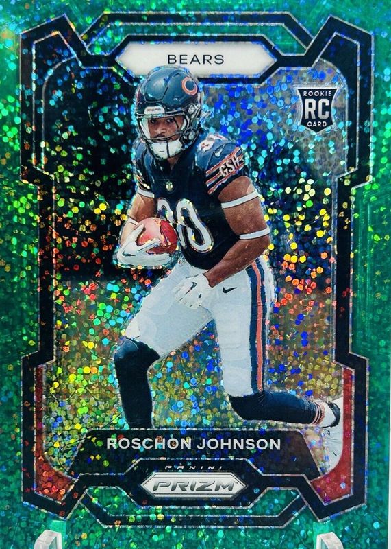 The Roschon Johnson 2023 Prizm #314 Green Sparkle /8 Rookie card in Raw condition has not changed in price in the last 30 days and was last sold for $63.00 .