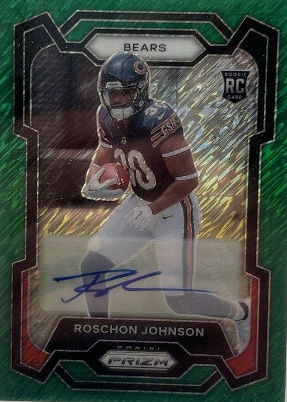 This card is 1 of 82 Roschon Johnson's card variations in the 2023 Prizm set being tracked by Sports Card Investor, including Base, Disco, Green, Green Ice, and Green Wave.