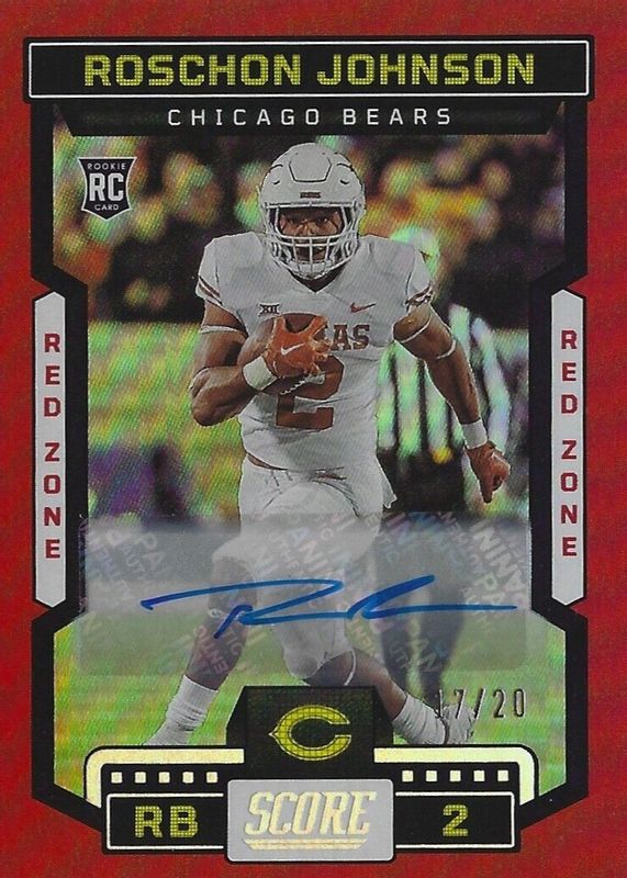 The Roschon Johnson 2023 Score #335 Rookie Signatures - Red Zone /20 card in Raw condition has not changed in price in the last 30 days and was last sold for $75.00 .