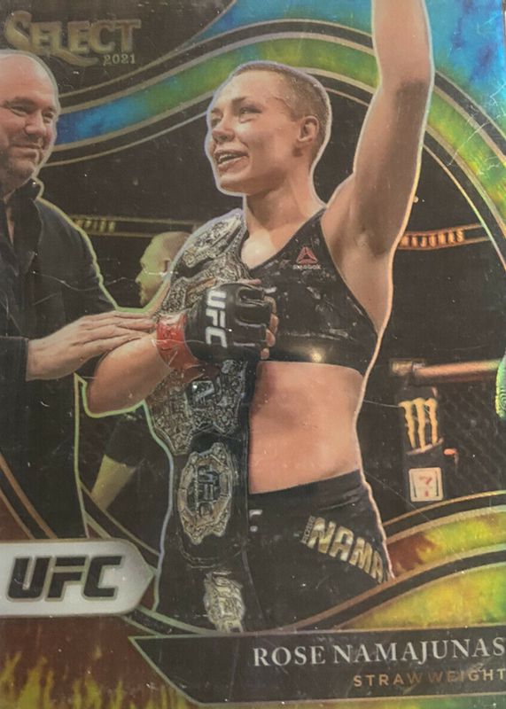 This card is 1 of 48 Rose Namajunas' card variations in the 2021 Select UFC set being tracked by Sports Card Investor, including Concourse Disco, Concourse Scope, Concourse Silver, Concourse Tri-Color, and Octagonside Disco.