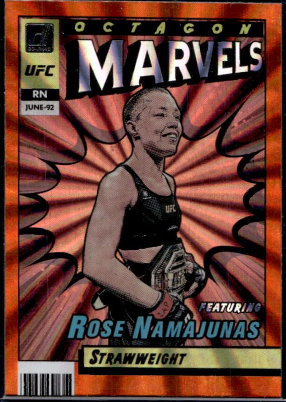 The Rose Namajunas 2022 Donruss UFC #9 Octagon Marvels Holo Orange Laser card is 1 of 51 Rose Namajunas' card variations in the 2022 Donruss UFC set being tracked by Sports Card Investor, including Base, Green Flood, Holo Orange Laser, Holo Pink Laser, and Press Proof Purple.