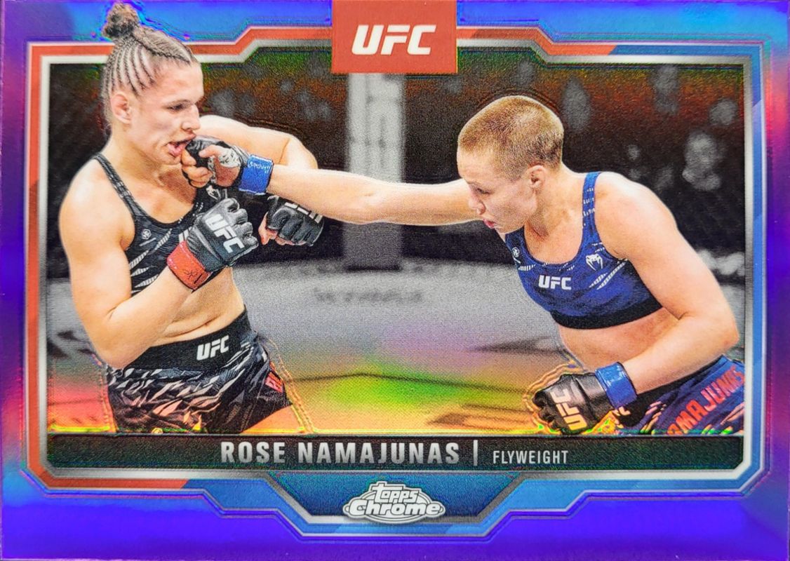 The Rose Namajunas 2025 Topps Chrome UFC #89 Purple Refractor card is 1 of 77 Rose Namajunas' card variations in the 2025 Topps Chrome UFC set being tracked by Sports Card Investor, including Base, Geometric Refractor, Negative Refractor, Prism Refractor, and Red & Blue Refractor.