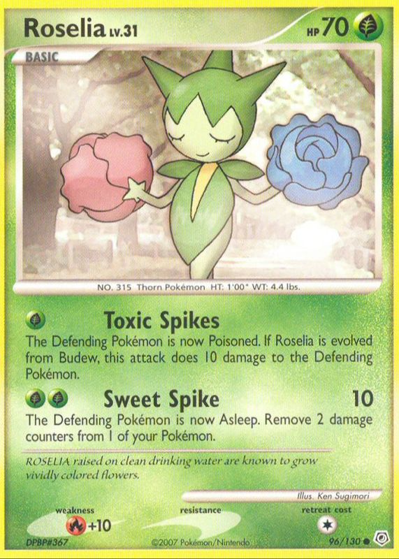 The Roselia 2007 Diamond & Pearl #096/130 Base card in Raw TCG (Lightly Played) condition has not changed in price in the last 30 days and was last sold for $1.35 .