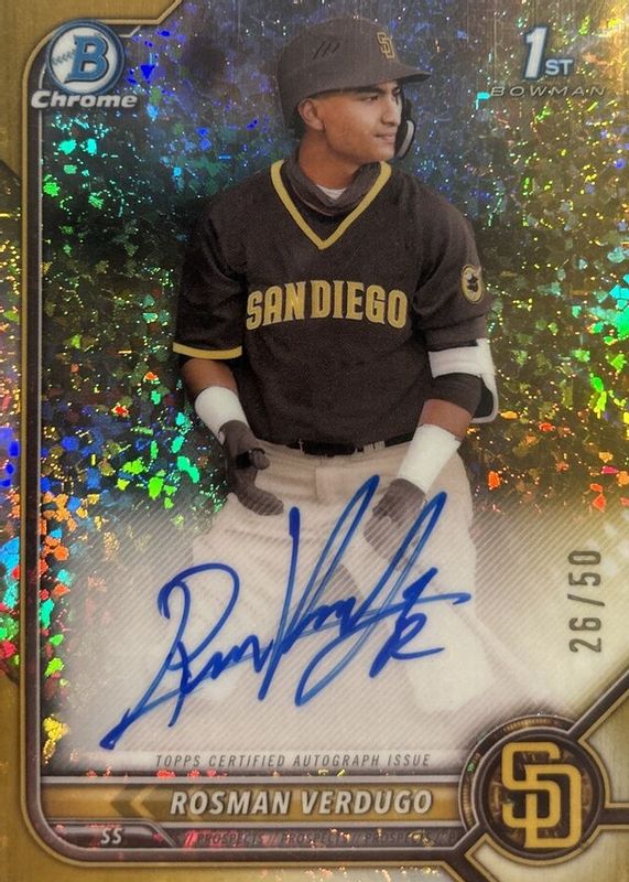This card is 1 of 47 Rosman Verdugo's card variations in the 2022 Bowman Chrome set being tracked by Sports Card Investor, including Prospects (1st), Prospects - Black & White Mini-Diamond Refractor (1st), Prospects - Shimmer Refractor (1st), Prospects - Refractor /499 (1st), and Prospects - Speckle Refractor /299 (1st).