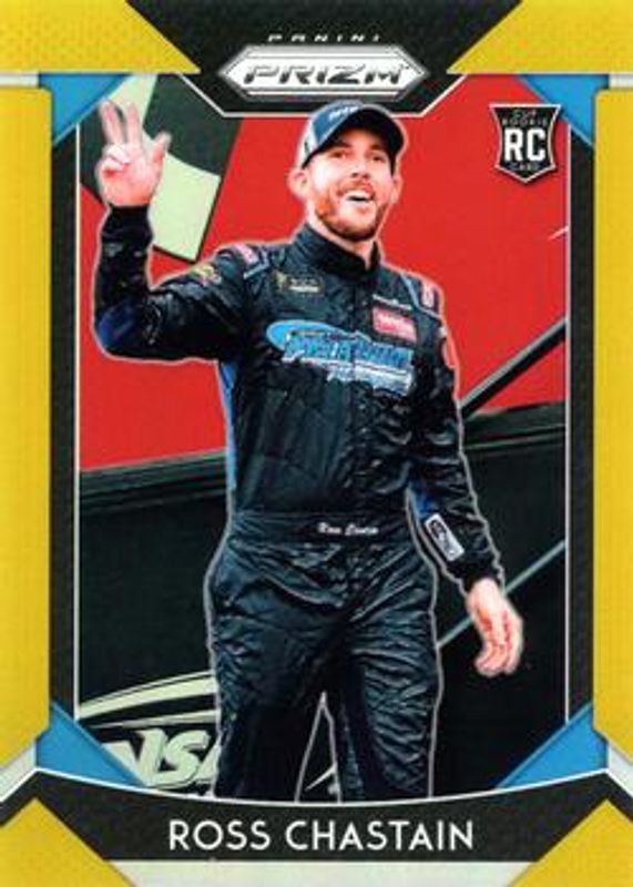The Ross Chastain 2019 Prizm NASCAR #13 Gold /10 card is 1 of 16 Ross Chastain's card variations in the 2019 Prizm NASCAR set being tracked by Sports Card Investor, including Base, Camo, Purple Flash (Hobby), Red White Blue, and White Sparkles (Promo).