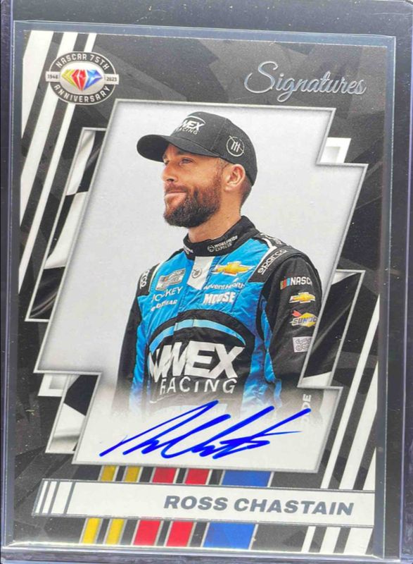The Ross Chastain 2023 National Treasures NASCAR #75-RC NASCAR 75th Anniversary Signatures card is 1 of 57 Ross Chastain's card variations in the 2023 National Treasures NASCAR set being tracked by Sports Card Investor, including Base /25, Midnight /20, Holo Silver /15, Stars & Stripes /13, and Holo Gold /10.