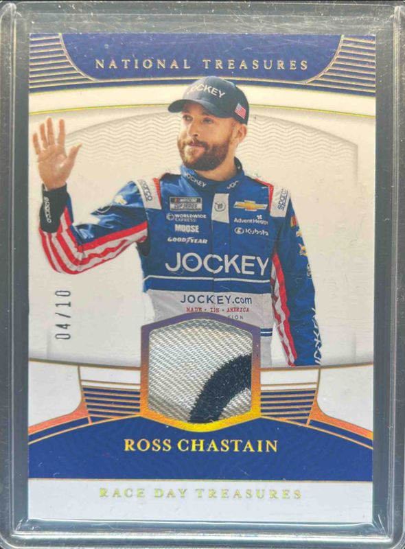 The Ross Chastain 2023 National Treasures NASCAR #RDT-RCT Race Day Treasures Firesuits Prime /10 card is 1 of 57 Ross Chastain's card variations in the 2023 National Treasures NASCAR set being tracked by Sports Card Investor, including Base /25, Midnight /20, Holo Silver /15, Stars & Stripes /13, and Holo Gold /10.