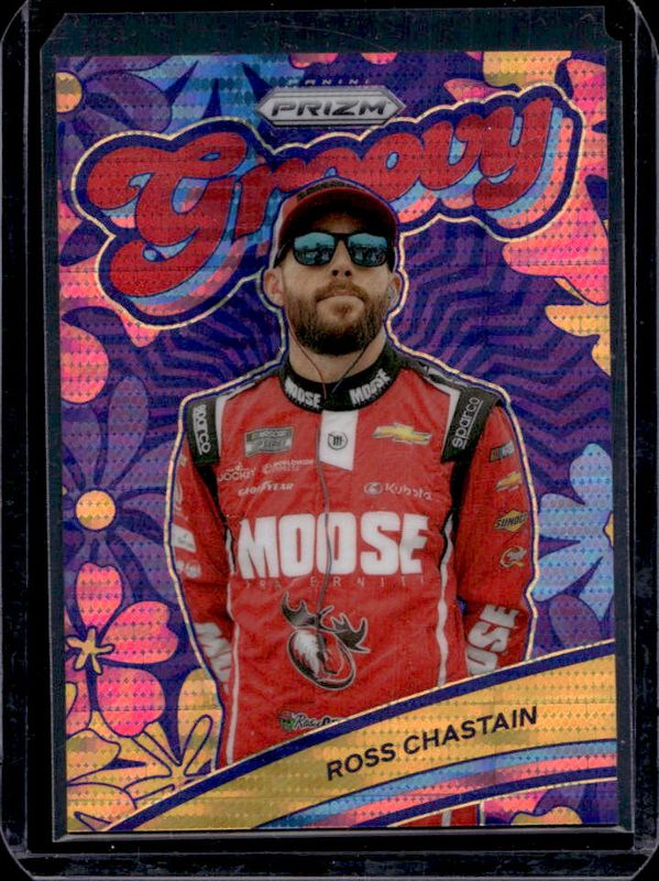 The Ross Chastain 2024 Prizm NASCAR #18 Groovy - Red Pulsar /199 card is 1 of 82 Ross Chastain's card variations in the 2024 Prizm NASCAR set being tracked by Sports Card Investor, including Base, Blue Ice, Green, Green Ice, and Red Ice.