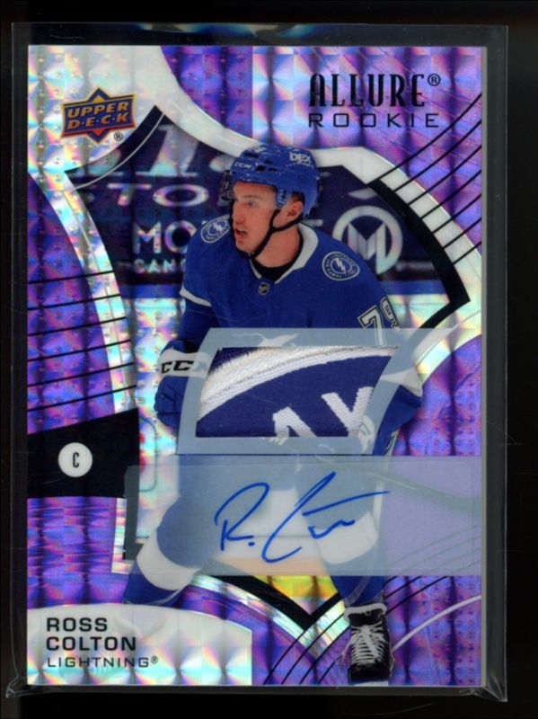 The Ross Colton 2021 Upper Deck Allure #144 Auto Mem - Purple Diamond /10 Rookie card is 1 of 45 Ross Colton's card variations in the 2021 Upper Deck Allure set being tracked by Sports Card Investor, including Base, 1917 Shield, 2005 Shield, Black Rainbow, and Blue China.