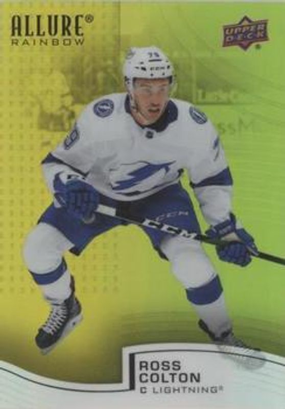 The Ross Colton 2021 Upper Deck Allure #R-25 Rainbow Yellow - Green Rookie card is 1 of 45 Ross Colton's card variations in the 2021 Upper Deck Allure set being tracked by Sports Card Investor, including Base, 1917 Shield, 2005 Shield, Black Rainbow, and Blue China.