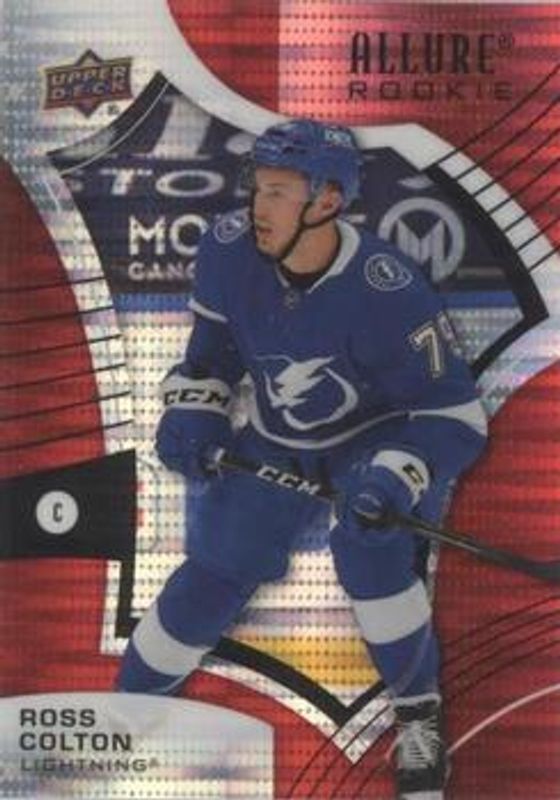 The Ross Colton 2021 Upper Deck Allure #144 Red Rainbow Rookie card is 1 of 45 Ross Colton's card variations in the 2021 Upper Deck Allure set being tracked by Sports Card Investor, including Base, 1917 Shield, 2005 Shield, Black Rainbow, and Blue China.