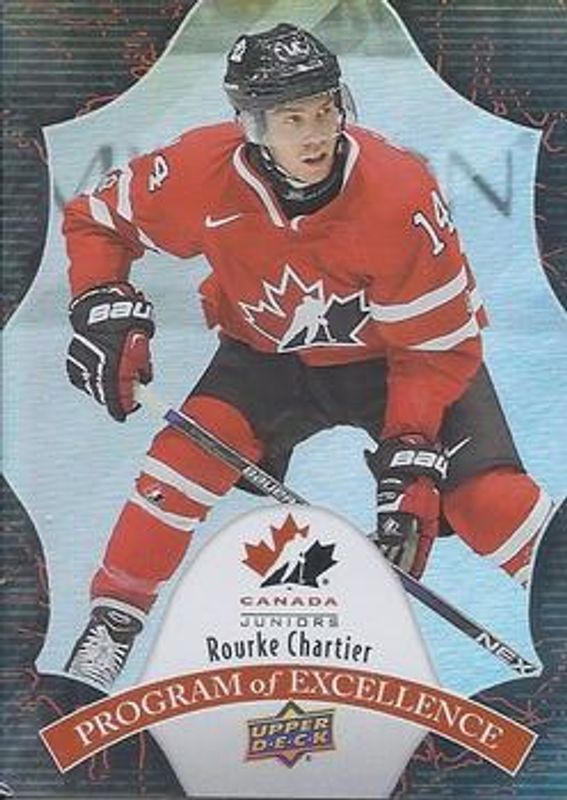The Rourke Chartier 2016 Upper Deck Team Canada Juniors #POE-12 Program of Excellence card is 1 of 30 Rourke Chartier's card variations in the 2016 Upper Deck Team Canada Juniors set being tracked by Sports Card Investor, including #35 Base, #112 Base, #35 Exclusives /175, #35 High Gloss Spectrum /25, and #35 Gold /16.