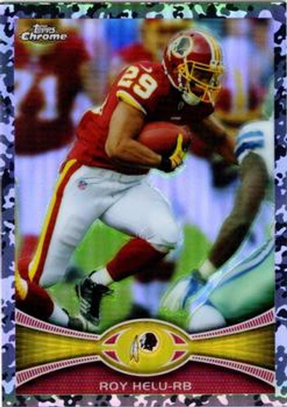 The Roy Helu 2012 Topps Chrome #218 Camo Refractor /499 card is 1 of 18 Roy Helu's card variations in the 2012 Topps Chrome set being tracked by Sports Card Investor, including Base, Orange Refractor, Refractor, X-Fractor, and Purple Refractor /499.