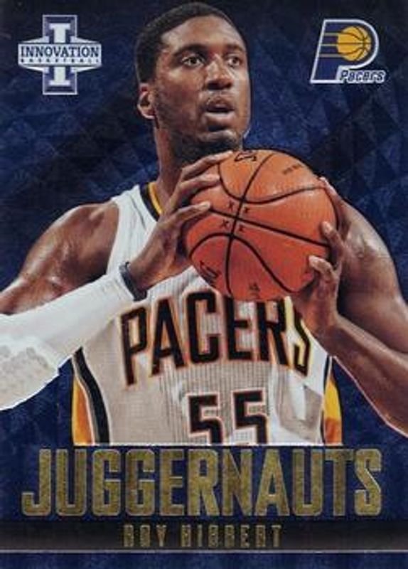 The Roy Hibbert 2013 Innovation #13 Juggernauts card is 1 of 12 Roy Hibbert's card variations in the 2013 Innovation set being tracked by Sports Card Investor, including Rookie View - Purple, Swat Team, Rookie View /199, Stained Glass /(SSP), and Stained Glass - Gold /(SSP).
