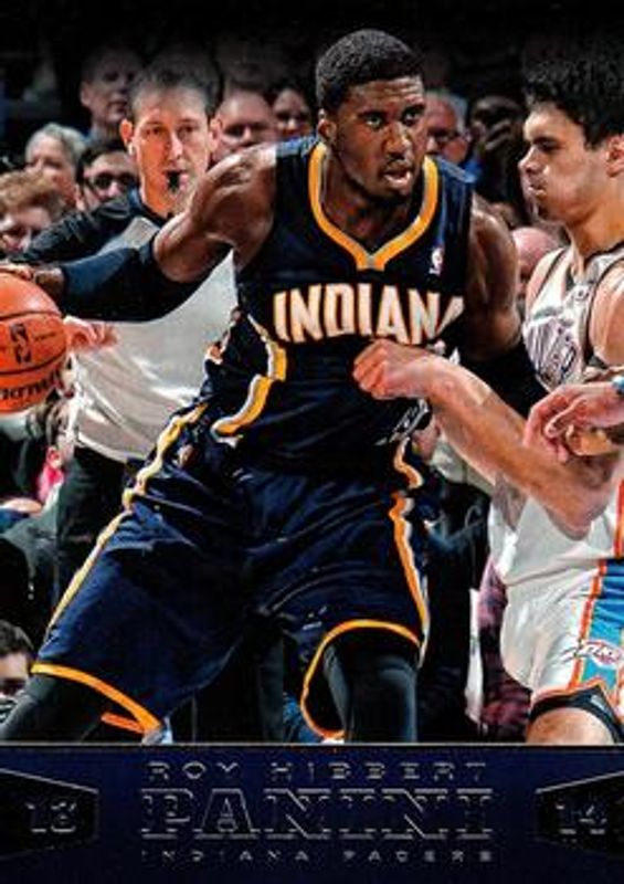 The Roy Hibbert 2013 Panini #74 Base card is 1 of 7 Roy Hibbert's card variations in the 2013 Panini set being tracked by Sports Card Investor, including Gold Knights, Red Knights, Black Knights /1, All Panini, and All Panini - Gold.