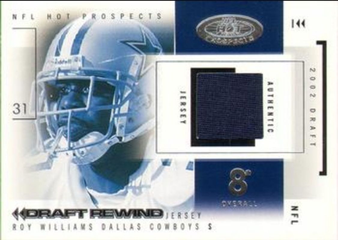 The Roy Williams 2004 Fleer Hot Prospects #DR/RW1 Draft Rewind Jersey /154 Rookie card is 1 of 27 Roy Williams' card variations in the 2004 Fleer Hot Prospects set being tracked by Sports Card Investor, including #22 Base /350, #88 Base /350, #22 Red Hot /50, #88 Red Hot /50, and #22 White Hot /1.